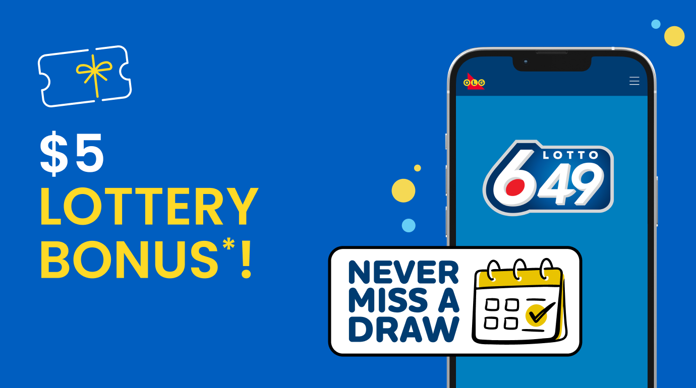 * Terms and Conditions apply. Must be 18 years of age or older and a resident of Ontario located in the province at the time of opt-in & play. An individual’s eligibility to participate in this Promotion is subject to OLG’s current policies, including the Responsible Gambling and My PlayBreak Policy, and the Promotion Terms. Must have a valid OLG.ca Player Account that has been selected to participate in this Promotion. To receive the $5 Lottery Bonus pursuant to this Promotion, an Eligible Participant must opt-in and purchase a LOTTO 6/49 Never Miss a Draw subscription before March 25, 2026 and keep it active for 7 days.